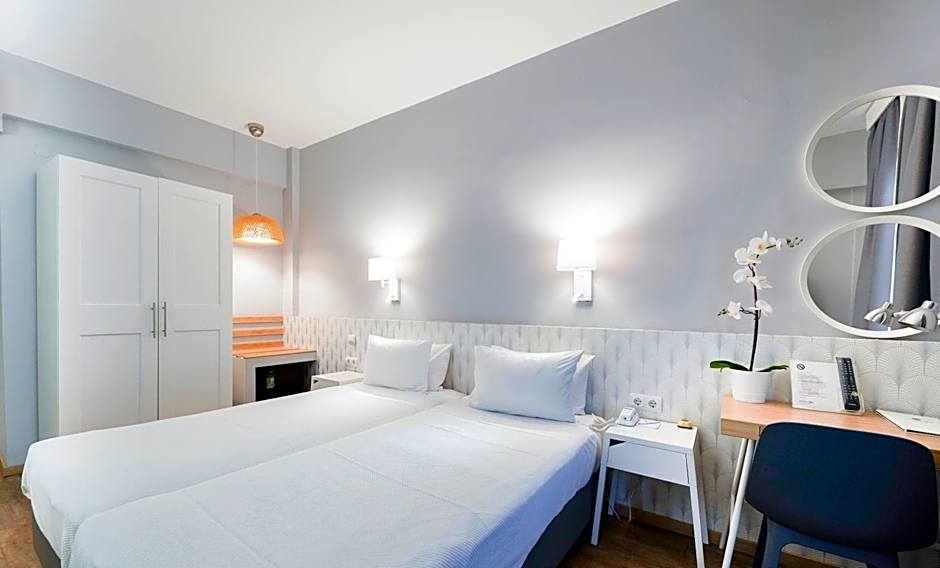A twin bedded room with balcony and city view, features a private shower with complimentary toiletries. Other features include a daily maid service, free WIFI, flat TV, air conditioning (centralized fan coils, cooling from May to September and heating from October to April, approximate dates depending on the weather), mini fridge, safe, direct dial telephone, laundry service.
